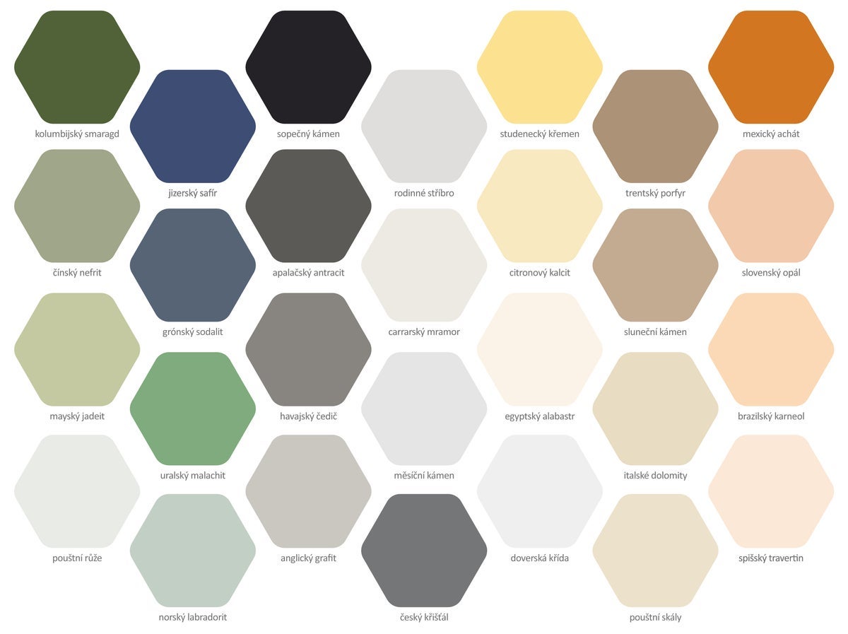 Odstíny pojmenované po drahých kamenech jako grónský sodalit či mexický achát navozují konkrétní emoce. Pomůže vám i rozdělení do čtyř palet podle nálady a stylu. Navíc lze vybírat z 20 000 dalších odstínů na míru.