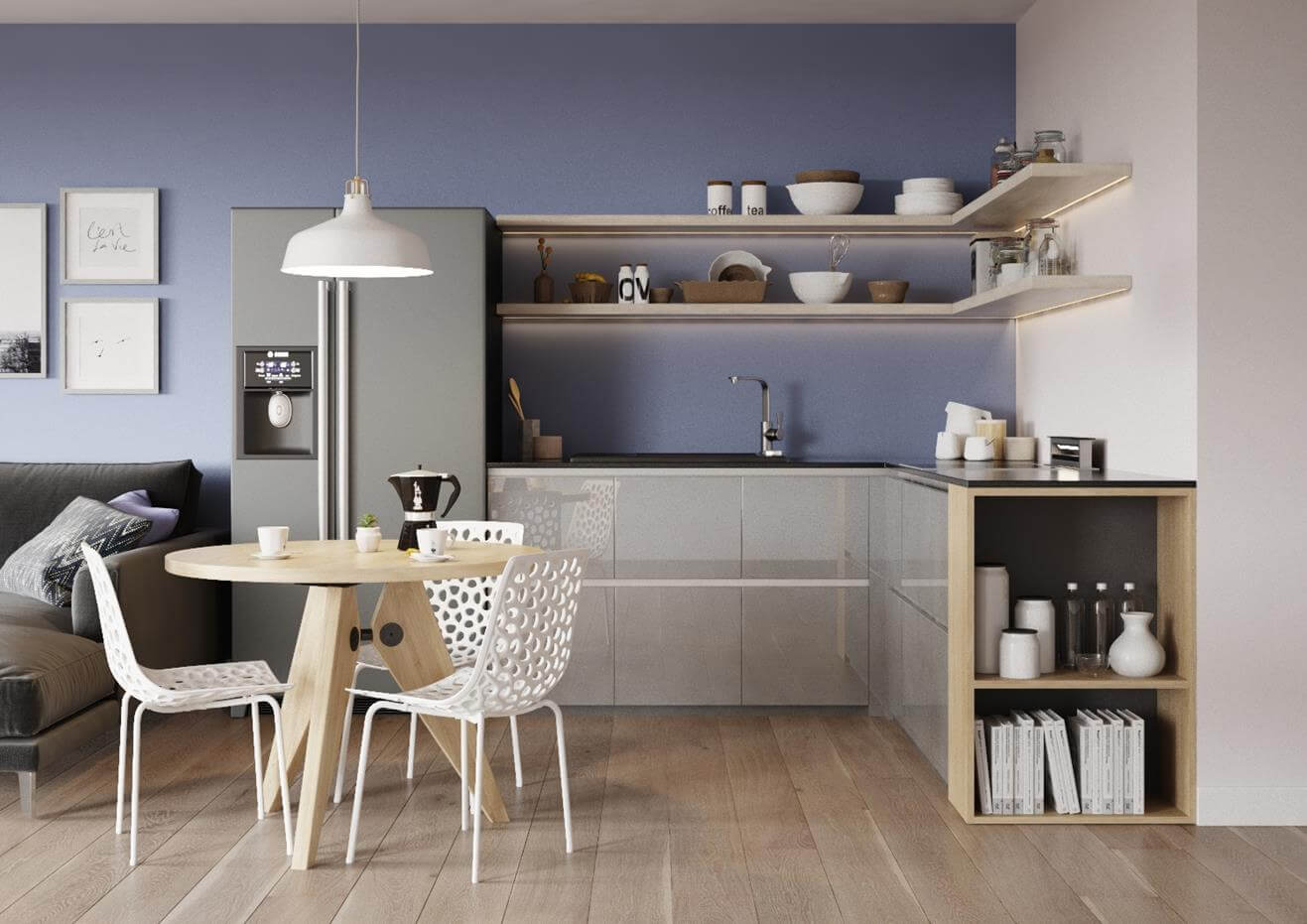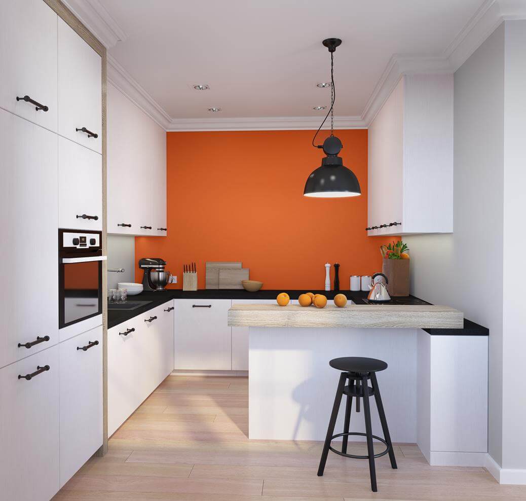 The kitchen is usually a busy area where a lot is happening. Kitchen furniture, appliances, lighting, and the dining zone should all work together to create a perfect match. The colour of the walls in the kitchen should serve as a neutral background, unlike the living room where you can be more playful with colours. This does not mean the kitchen can’t have unusual or creative solutions.