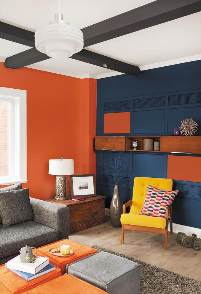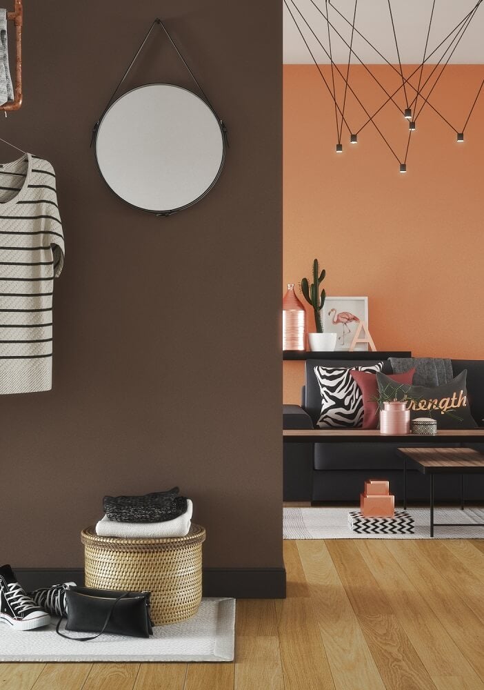 A striking combination of contrasting cinnamon and blue shades creates a surprising yet harmonious look. Accessories and furnishings in geometric shapes and patterns play an equally important role in bringing this style to life. Vintage patterned pieces found at a Saturday flea market can add authentic charm and character.