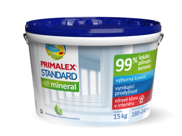 Primalex STANDARD Mineral je biely vnútorný maliarsky náter na báze prírodných surovín, ktorý spĺňa všetky základné požiadavky na úžitkové vlastnosti do bežných a nenáročných priestorov. Trvale garantuje výbornú kryciu schopnosť, vynikajúcu paropriepustnosť a belosť (~85 % BaSO₄). Vďaka 99 % prírodnému zloženiu bez obsahu prchavých látok pomáha udržiavať čistý a zdravý domov.
